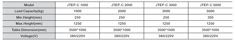 The JTEP-C Series Electric Lift Platform is a heavy-duty industrial solution designed for high-capacity lifting tasks. With a robust load range from 1000kg to 5000kg, it features an expansive 3500mm x 1000mm work surface, making it ideal for handling oversized materials in warehouses and production lines. Engineered for stability and precision, the series offers a maximum lift height of 1250mm and dual-voltage compatibility (380V/220V) to suit diverse industrial power standards.