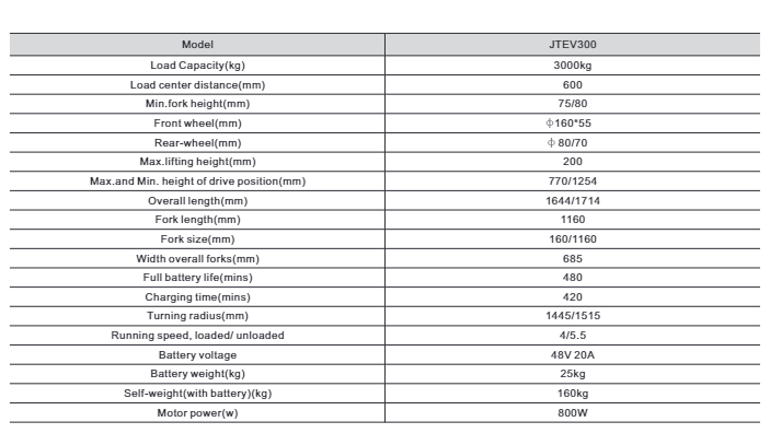 The JTEV300 is a heavy-duty electric pallet truck designed for maximum efficiency in high-volume environments. With a massive 3000kg load capacity and an 800W motor, it effortlessly handles heavy pallets at speeds up to 5.5 km/h. Its robust 48V 20A battery provides an industry-leading 480 minutes of runtime, ensuring a full shift of productivity without frequent recharging.