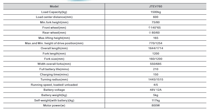 JTEV760 is a highly efficient, compact electric pallet truck designed for fast-paced warehouse environments. With a